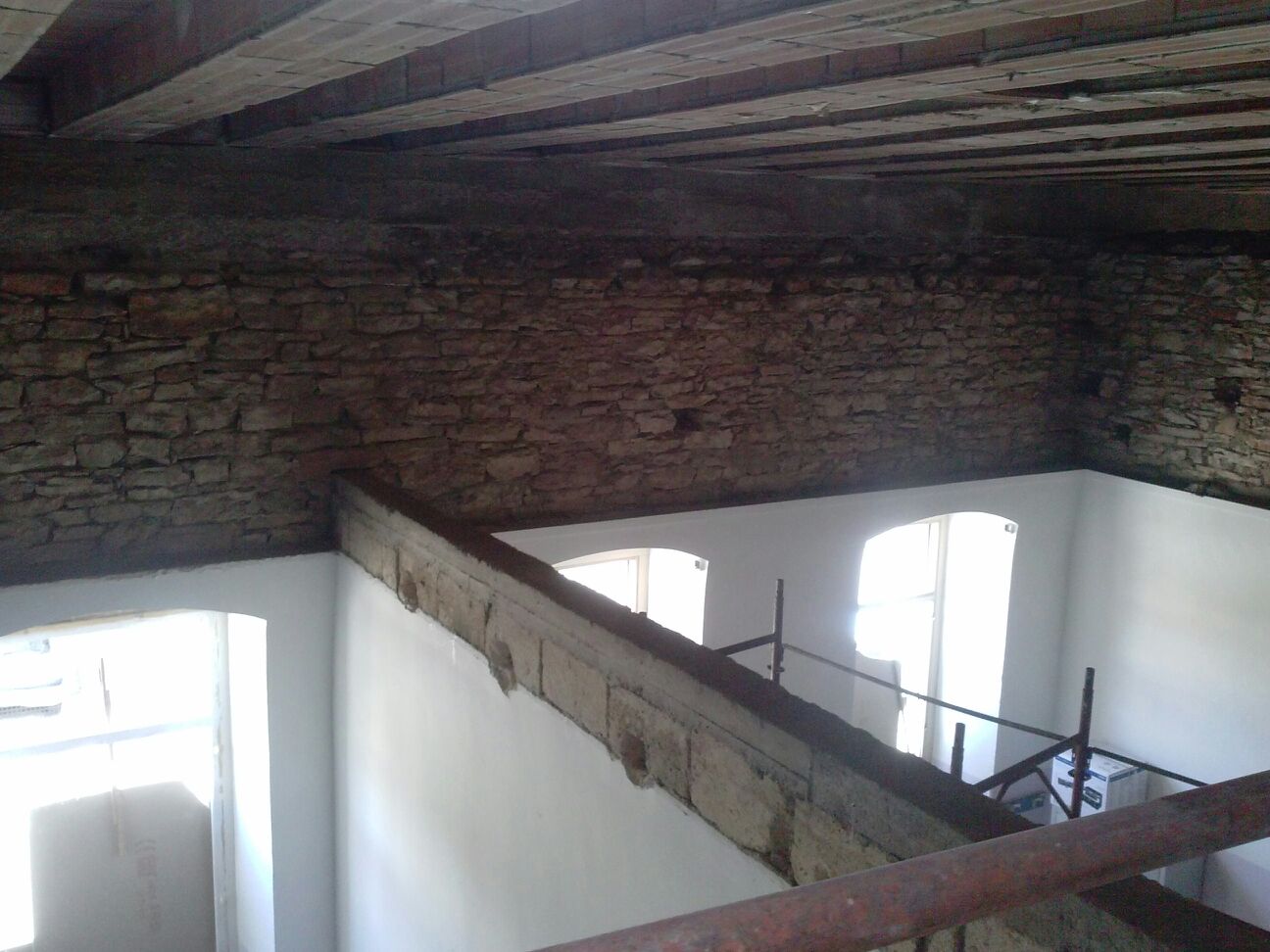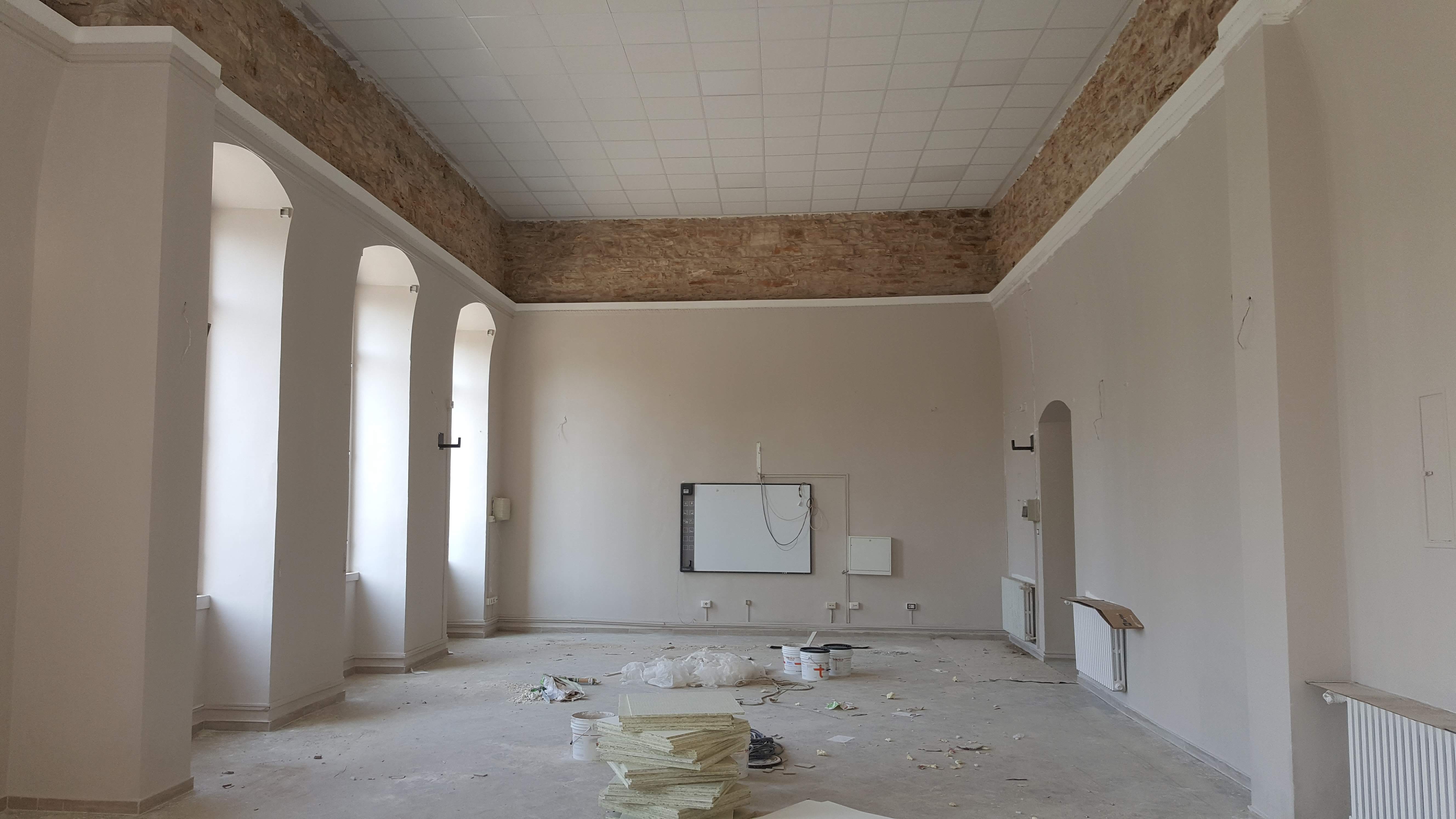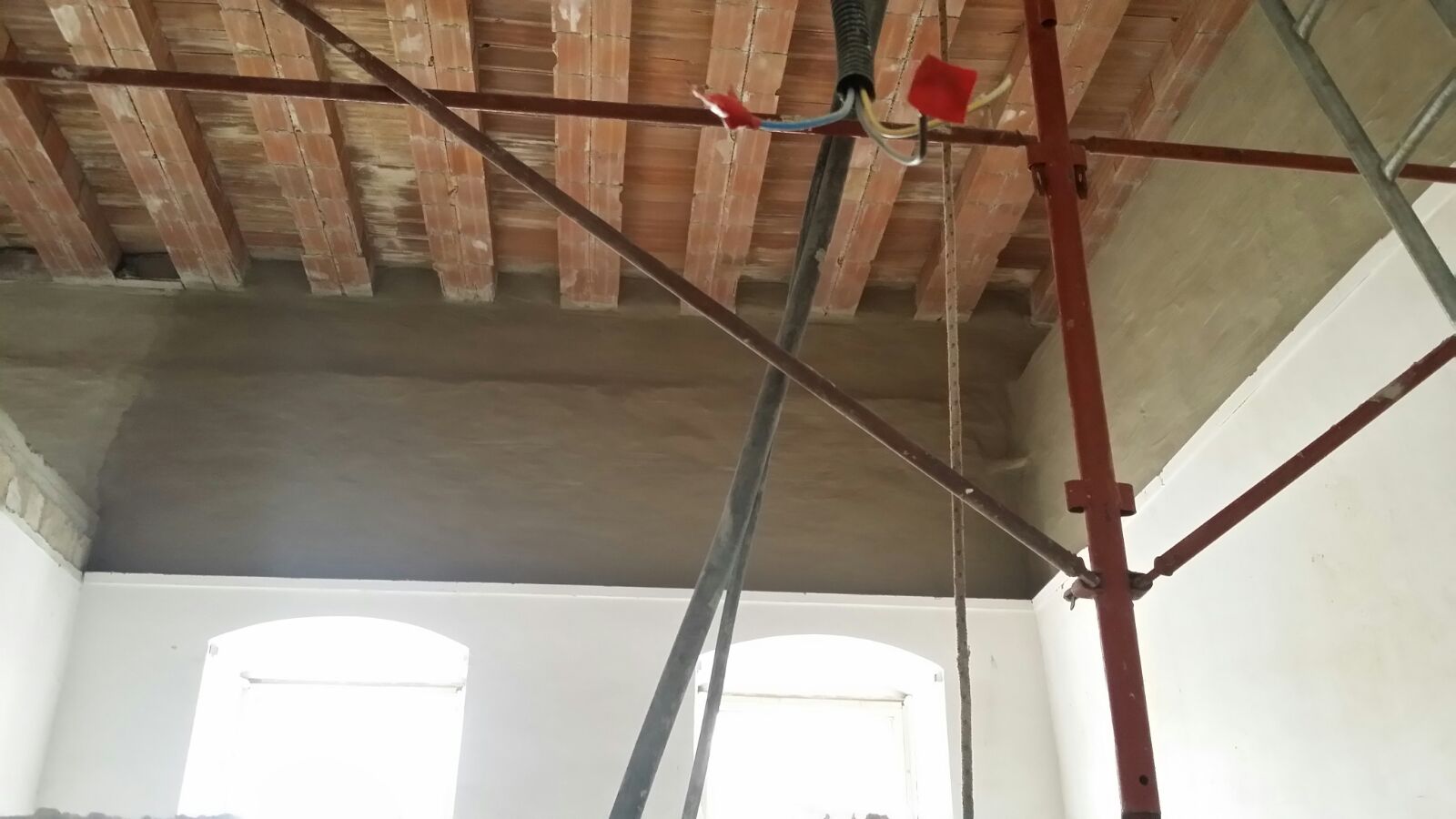 e. Realizzazione di intonaco armato monolaterale, da eseguirsi (mediante applicazione di malta strutturale fibrorinforzata e rete di vetro) nella zona delle aule al di sopra dell’imposta vecchie volte esistenti, al fine di eliminare la discontinuità materica dei paramenti murari soprastanti rispetto a quelli sottostanti;