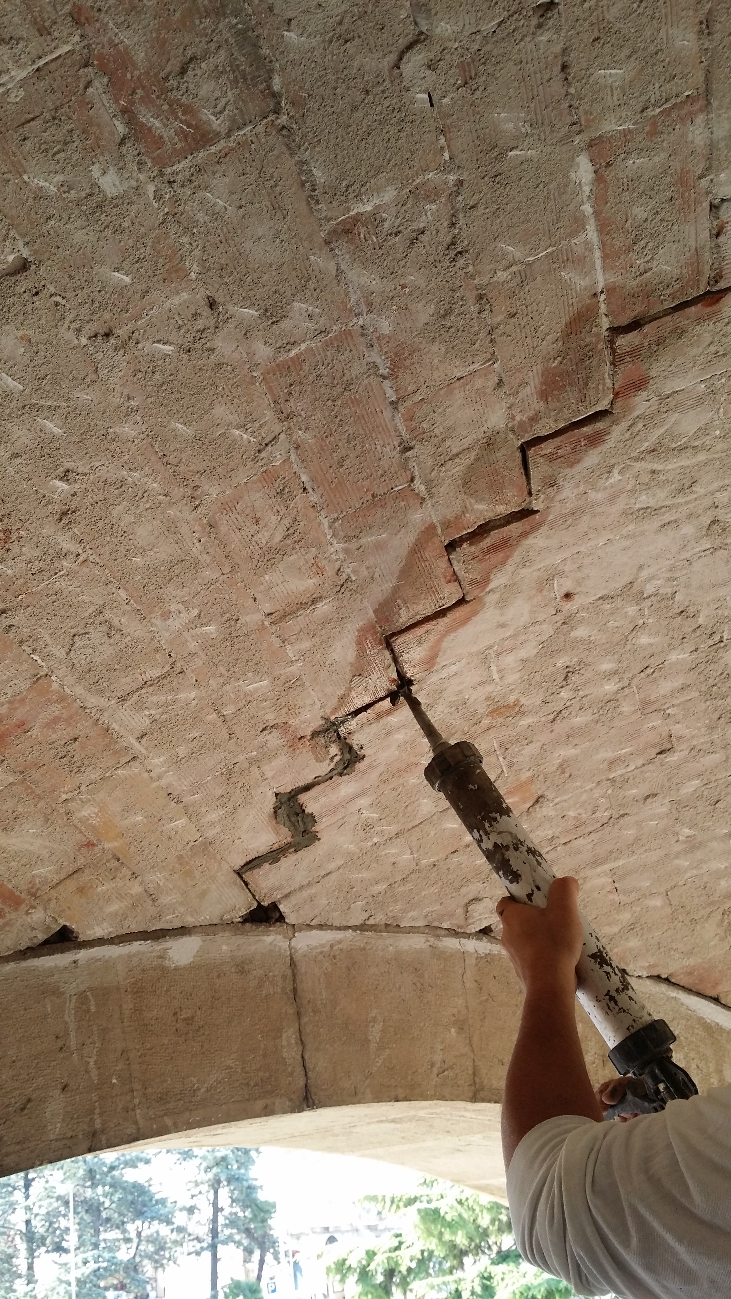 Per le volte a crociera dell’ingresso monumentale, costituite da elementi forati in laterizio, sono state predisposte catene in acciaio e relativi capichiave metallici e applicate all’intradosso delle stesse fasce in FRP.